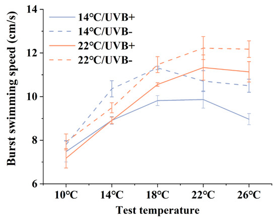 The burst swimming speed of the tadpoles follows an inverted U-shaped trend with increasing test temperature (Figure 2). The burst swimming speed was low at 10 °C, and there was no significant difference (F3,30 = 0.717, p > 0.05) among all groups, which suggests that the temperature and UVBR had no effect on the burst swimming speed at low temperatures. Interestingly, when the test temperature was set to the exposure temperatures, the burst swimming speeds of the 14 °C/UVB-free and 22 °C/UVB-free groups were higher (although some comparisons were not statistically different) than those of the other groups, respectively. This suggests that the tadpoles’ burst swimming speed showed a certain thermal adaptability after a period of exposure in the absence of UVBR.