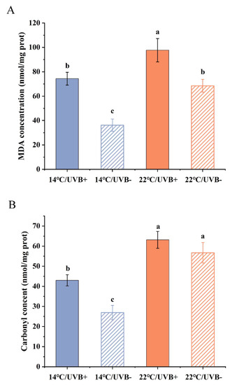 The protein carbonyl concentration in the 22 °C groups was higher than that in the 14 °C groups (Figure 3B) (UVBR group: F3,20 = 13.436, p < 0.01, UVBR-free group: F3,20 = 13.436, p < 0.01). Meanwhile, the protein carbonyl concentration in the 14 °C/UVBR group was significantly higher than that of the 14 °C/UVBR-free group (F3,20 = 13.436, p < 0.05), but there was no significant difference in protein carbonyl concentration between the 22 °C groups (Figure 3B) (F3,20 = 13.436, p > 0.05).