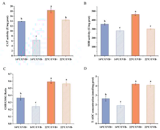 Effect of UVBR (solid bars) and UVBR–free (patterned bars) environments in combination with a 14 (blue bars) or 22 °C (red bars) temperature on the CAT activity (A), SOD activity (B), GSH/GSSG ratio (C), and T-AOC (D) in whole-body Rana kukunoris tadpoles. Data are presented as means ± standard error. Lowercase letters above bars denote significant differences between treatments.