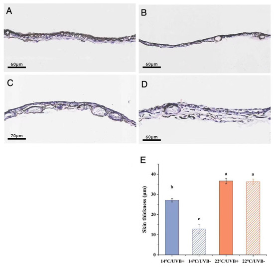 Rana kukunoris dorsal skin section. (A) Dorsal skin of a tadpole in the 14 °C/UVBR group (Stage G31). (B) Dorsal skin of a tadpole in the 14 °C/UVBR–free group (Stage G34). (C) Dorsal skin of a tadpole in the 22 °C/UVBR group (Stage G38). (D) Dorsal skin of a tadpole in the 22 °C/UVBR–free group (Stage G39). (E) Effect of UVBR (solid bars) and UVBR-free (patterned bars) environments in combination with a 14 (blue bars) or 22 °C (red bars) temperature on skin thickness as determined by examining the tadpole sections. Data are presented as means ± standard error. Lowercase letters above bars denote significant differences between groups.