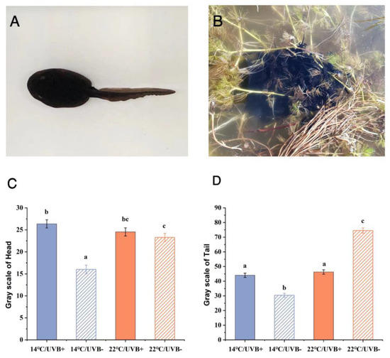 (A) Rana kukunoris tadpole in Stage G30. (B) Aggregation behavior of Rana kukunoris tadpoles in a wild pond. (C,D) Effect of UVBR (solid bars) and UVBR–free (patterned bars) environments in combination with a 14 (blue bars) or 22 °C (red bars) temperature on the grayscale value of the head (C) and tail fin (D), respectively. Data are presented as means ± standard error. Lowercase letters above bars denote significant differences between groups. The color of the tadpole is expressed by grayscale, with a smaller gray value representing a darker body color. The grayscale value of both the head and the tail fin in the 14 °C/UVBR–free groups was significantly lower than that of the 14 °C/UVBR groups. However, under 22 °C exposure, the grayscale of the tail fin in the UVBR group was significantly lower than that in the UVBR–free group.