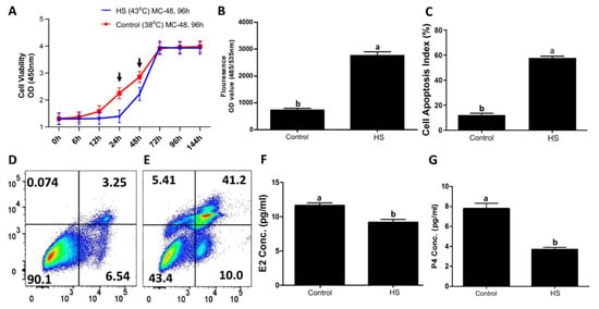In vitro heat stress (43 °C for 2 h) versus the control (38 °C) treatment decreased cell viability, increased intracellular ROS accumulation, increased the incidence of apoptosis, and decreased the estrogen (E2) and progesterone (P4) syntheses in bovine granulosa cells [21,22]. Heat stress exposure decreased granulosa cell viability (A) Cell proliferation curves with mean optical densities (ODs) were plotted against different recovery time points in hours (h) for both groups. Heat stress exposure increased intracellular ROS accumulation in granulosa cells (B) fluorocolorimetric OD values of ROS in cells are shown (B). Heat stress exposure elevated granulosa cell apoptosis and decreased viability (C) Flow cytometry analysis of granulosa cells cultured under heat stress (E) and the corresponding control (D) are presented. Heat stress exposure decreased E2 (F) and P4 (G) synthesis by granulosa cells (A). All data are presented as means ± S.E. Time points (24 and 48 h) with black arrow signs above them are significantly (p < 0.05) different (A), while “MC” refers to the culture media change at the given hours (A). Means without common letters (a, b) are significantly different (p < 0.05).