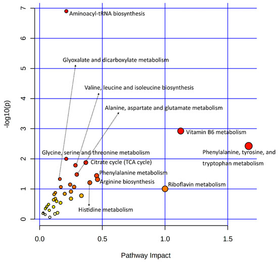 A dot plot illustration of pathway enrichment by significantly differentially expressed metabolites was used in this study. Various pathways within the upper and left quadrants are labeled. The dot sizes increase with the increasing pathway impact; the color intensifies according to the y-axis.