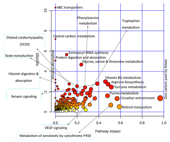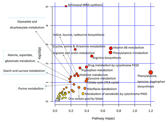 A dot plot illustration of the metabolic pathway enrichment in a joint analysis of significantly differentially expressed genes and important metabolites from transcriptome and metabolome data, respectively. Various metabolic pathways in the upper and left quadrants are labeled. The dot sizes increase with the increasing pathway impact; the color intensifies according to the y-axis.