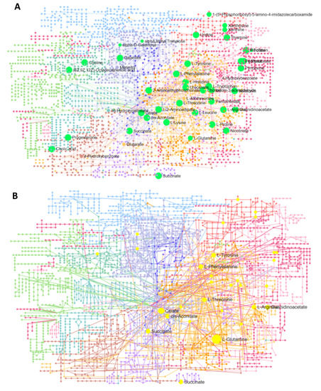 A network analysis of pathways carried out using an integrated analysis of all pathways (using transcriptome and metabolome data input); (A) presents the comprehensive network of integrated pathways, where all mapped queries of metabolites (highlighted in light green) are involved in pathways with more than one hit are labeled. Similarly, (B) shows the same network, with metabolite nodes involved in multiple pathways (highlighted in yellow) with more than one hit being labeled.