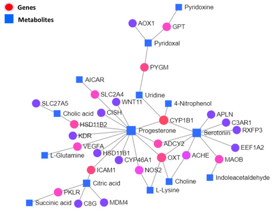 Significantly differentially expressed genes and metabolites were used to carry out the KEGG-based interactive network analysis among them, as shown in the interaction network illustration in Figure 7, where important nodes are highlighted. Statistical details of joint interactions of top interactions and those involving two or more nodes along their regulation statuses in the respective studies are presented in Table 4; the complete statistical details of this network are given in Supplementary Table S6.