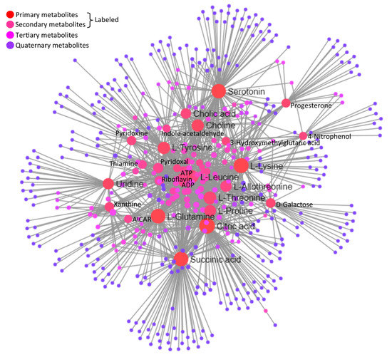 Integrated network illustration of differential metabolites based on the KEGG database. Circular nodes represent different metabolites at different degrees of interaction made through lines connecting and originating them. Central important metabolites in the network are labeled.