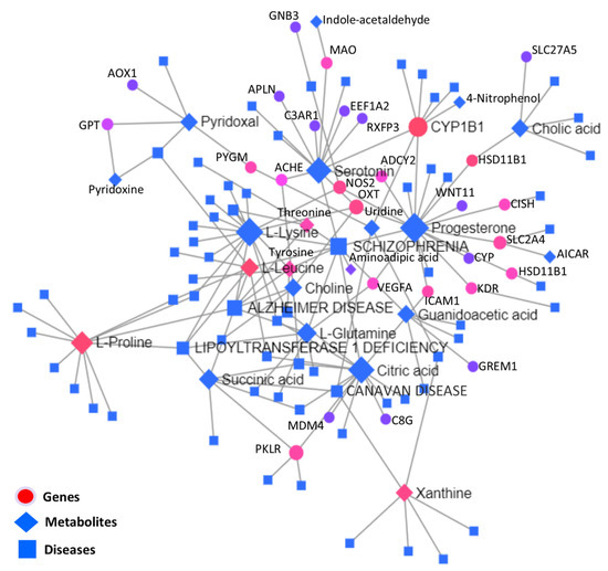 3.5.3. Interactive Network Analysis among Genes, Metabolites, and Diseases