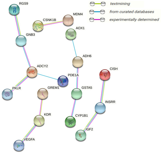 To obtain functional insights into the DEGs found in multiple integrations and the network analysis of transcriptomes and metabolomes, all DEGs were combined and a physical protein–protein interaction (PPI) network analysis (STRING) with a medium confidence score (0.4) was carried out, as presented in Figure 10. Based on experimentally verified–curated database interactions, and text mining, four subnetworks were observed. GNB3, KDR, CYP1B1, ADCY2, RGS9, INSRR, GSTA5, VEGFA, ADH6, IGF2, and MDM4 were the central network nodes.