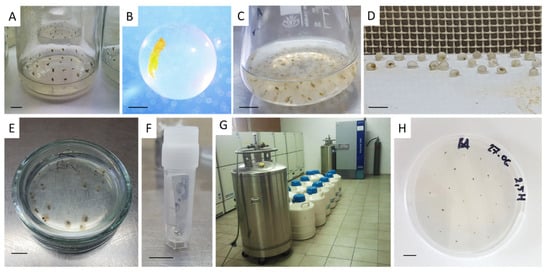 Cryopreservation steps of the encapsulation-dehydration, encapsulation-vitrification, and droplet-vitrification techniques: (A) preculture of nodal explants on the medium with an increased sucrose and ABA concentration; (B) shoot tip encapsulated in calcium alginate; (C) osmotic dehydration of encapsulated explants in a concentrated sucrose solution; (D) air drying of explants; (E) dehydration in PVS; (F) cryotube with aluminum foil strip and attached shoot tip; (G) cryobank in the Botanical Garden of the Polish Academy of Sciences in Warsaw, Poland; (H) recovery of explants on a cytokinin-supplemented medium. Bar = 1 cm (except for Figure 2(B)—1 mm).