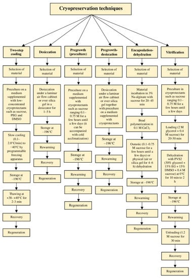 It is estimated that approximately 13% of higher plants are on the brink of extinction. Many of those endangered species are fruit and ornamental plants. Several environmental and endogenous factors alter the level of plant biodiversity in natural populations, which is the basis of evolution and adaptation [1]. The rapid development of proper approaches for the long-term preservation of genetic resources seems to be necessary. Germplasm is a live information source for all the genes present in the respective plant, which can be conserved for long time spans and regenerated whenever it is required (particularly for crop breeding and improvement) [2,3]. Conventional in situ and ex situ conservation of germplasms through seed storage, clonal means, gene banks, national parks, sanctuaries, natural habitats, botanical gardens, and cold storage have some limitations regarding efficacy, genetic erosion, security, costs, and long-term maintenance [4]. Conservation of plant biodiversity through innovative biotechnology techniques includes cryopreservation.