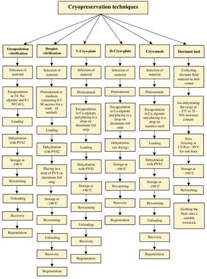 Rapid and ultra-rapid cooling rates are typical for vitrification-based cryoprotocols that involve some level of dehydration by exposure of tissues to highly concentrated solutions of cryoprotectants and/or too strong physical drying (desiccation) [19]. Consequently, most or all freezable water is removed, and the internal solutes vitrify when the explant is plunged into LN [46]. A plant vitrification solution (PVS), which is a mixture of two, three, or four cryoprotectors, provides a transition of the remaining intracellular water to the amorphous “biological glass” state [6]. Different modern methods (vitrification, droplet-vitrification, encapsulation-dehydration, encapsulation-vitrification, and cryo-plates) have been adapted for the cryopreservation of complex organs such as shoot tips/apices and somatic embryos [19] (Figure 3). Most of these methods have been derived from the two most basic cryogenic strategies, vitrification, and encapsulation-dehydration [13].