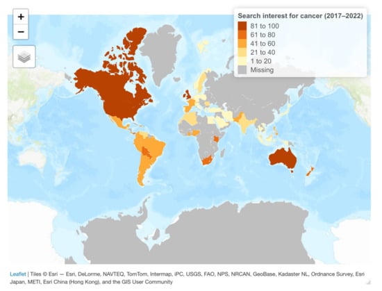 - Schootman, M.; Toor, A.; Cavazos-Rehg, P.; Jeffe, D.B.; McQueen, A.; Eberth, J.; Davidson, N.O. The utility of Google Trends data to examine interest in cancer screening. BMJ Open 2015, 5, e006678. [Google Scholar] [CrossRef]