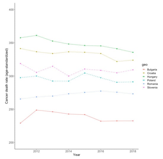 - Vrdoljak, E.; Wojtukiewicz, M.Z.; Pienkowski, T.; Bodoky, G.; Berzinec, P.; Finek, J.; Todorović, V.; Borojević, N.; Croitoru, A. Cancer epidemiology in Central and South Eastern European countries. Croat. Med. J. 2011, 52, 478–487. [Google Scholar] [CrossRef]