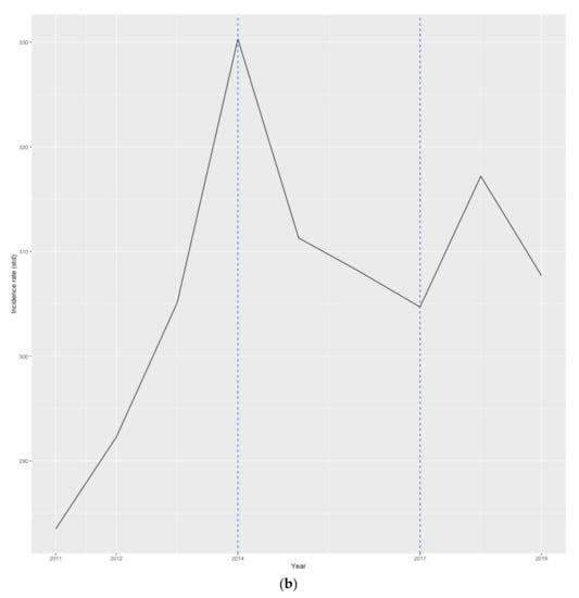 - Gillis, D.; Edwards, B.P. The utility of joinpoint regression for estimating population parameters given changes in population structure. Heliyon 2019, 5, e02515. [Google Scholar] [CrossRef]