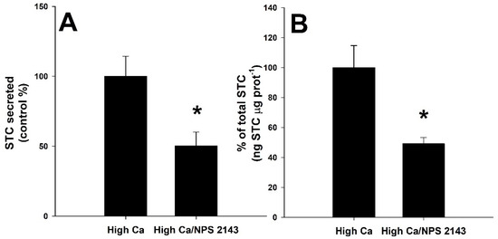 The effect of a CaSR antagonist is shown in Figure 3. Incubation with a high concentration of calcium (2.92 mM Ca2+) and the addition of 0.1 μM of the CaSR antagonist NPS-2143 (Figure 3A) decreased STC release from the CS to 50 ± 10% (mean ± SEM) of the control group (with 2.92 mM Ca2+ alone), with significant differences (Student´s t-test, p < 0.05). Moreover, the calcilytic NPS-2143 decreased significantly (Student´s t-test, p < 0.05) the total amount of STC compared to the control-high [Ca2+] group (49 ± 4%) (Figure 3B).