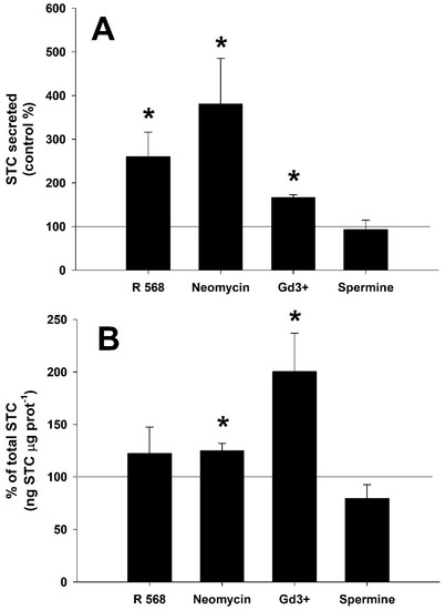 The effect of different CaSR agonists (R-568, neomycin, gadolinium, and spermine) was also tested (Figure 4). Significant increases when compared to the control CS STC release (Student´s t-test, p < 0.05) are shown in Figure 4A when incubated with calcimimetics R-568 (260 ± 56%), neomycin (381 ± 104%) and gadolinium (166 ± 6%). Spermine, at a concentration of 500 μM, did not affect the STC secretion rate (Student´s t-test, p > 0.05). The calcimimetics, neomycin and gadolinium, also increased significantly the total amount of STC (125 ± 7% and 200 ± 37%, respectively) of the incubated CS when compared to the control group (Figure 4B, Student´s t-test, p < 0.05).