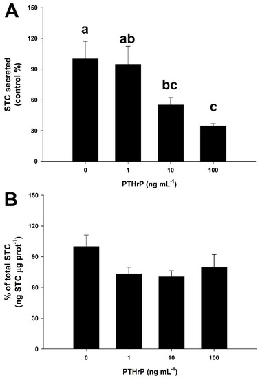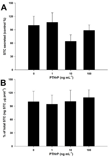 Figure 5A shows the inhibitory effect of increasing PTHrP concentrations on the STC secretion at normal (1.46 mM) calcium levels. PTHrP inhibits STC release from the CS in a dose-dependent manner, with significant differences between those groups submitted to 0 ng PTHrP mL−1 and 100 ng PTHrP mL−1 (one-way ANOVA followed by a Tukey´s test, p < 0.05). In this sense, the calculated effective dose 50 (ED50) was 17.51 ng PTHrP mL−1. The % of total STC (Figure 5B) showed variations in any of the groups tested (one-way ANOVA followed by a Tukey´s test, p > 0.05).