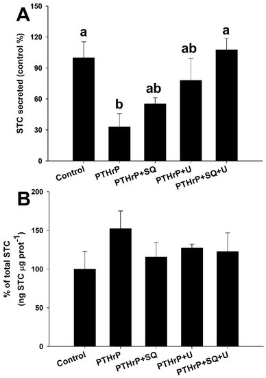 Figure 6 reveals that the tmAC inhibitor SQ-22536 and the PLC inhibitor U-73122, separately, slightly increased STC secretion (Figure 6A) when it is inhibited with 100 ng PTHrP mL−1, without being statistically different from the untreated-control or the PTHrP-treated groups (one-way ANOVA, followed by a Tukey´s test, p < 0.05). Moreover, using both inhibitors together abolished the inhibitory effect of PTHrP (107 ± 28% respecting the untreated-control group). No differences in STC production (Figure 6B) were observed between treatments (one-way ANOVA, followed by a Tukey´s test, p > 0.05).