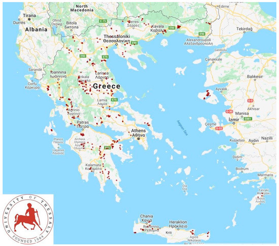 Figure 1. Location of 444 small-ruminant farms around Greece, which were visited for sampling of the bulk-tank raw milk for potential isolation of Listeria spp. (drawn with the use of GPS Visualizer (Adam Schneider; Portland, OR, USA)).