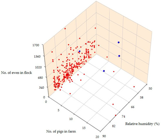 Figure 2. Scatterplot of predictors for the isolation of L. monocytogenes or L. ivanovii from the bulk-tank raw milk of sheep in Greece (red dots: farms from which no L. monocytogenes or L. ivanovii was isolated; blue dots: farms from which L. monocytogenes or L. ivanovii was isolated).