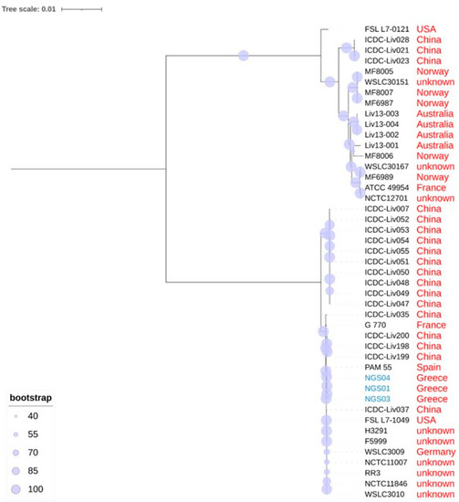 Figure 3. The maximum likelihood tree (GTRGAMMA model) of 45 L. ivanovii strains with bootstrapping support values (image created by Itol). Strains NGS01, NGS03 and NGS04, shown in blue typescript, were isolated from the bulk-tank raw milk of sheep during the present study.