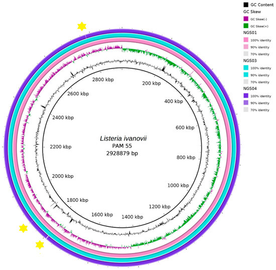 Figure 4. Comparison of the whole genome of three L. ivanovii strains (NGS01, NGS03, NGS04) isolated from the bulk-tank raw milk of sheep in Greece during the present study with the strain PAM 55, isolated in 1997 in Spain from an outbreak of abortion in sheep, using the tool BRIG; the yellow asterisks indicate the regions where the similarities of the NGS01, NGS03, NGS04 strains to PAM 55 were below 70%.