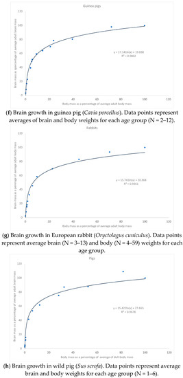 (a) Data from Figure 2b–h. (b) Data from Passingham, 1975; Harel et al., 1972 [4,30]. (c) Data from Count, 1947; Dobbing and Sands, 1973; Connolly, 1950; Spector, 1956; Dickerson et al.; 1982; Zilles, 1972; Kretschmann et al., 1986 [1,32,33,34,35,36,37]. (d) Data from Holdt et al., 1975; Falk et al., 1999 [3,38]. (e) Data from Agrawal et al., 1968 [39]. (f) Data from Agrawal et al., 1967 [40]. (g) Data from De Souza and Dobbing, 1971 [41]. (h) Data from Agrawal et al., 1968 [42].