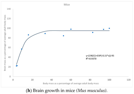 Yet again, the logistic equation provided good approximation (R2 = 0.90–0.99) to the growth of brain vs. body size in all placental mammal species falling into this group (humans, rhesus monkeys, dogs, cats, rats, and mice) (Figure 2a–g).