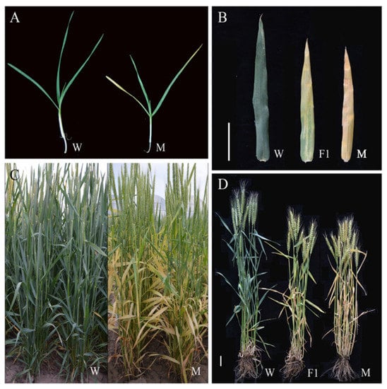 The GSm mutant was acquired from the common wheat cultivar Chang 6878 by EMS mutagenesis. Leaf yellowing and senescence were initiated at the tip of the first leaf in GSm during the three-leaf stage. Then, the first leaf turned yellow in most part of it (except for leaf base), while yellowing and senescence were initiated at the tip of the second leaf during the three-leaf-one-leaflet stage. After that, the first leaf turned completely yellow, the second leaf also turned yellow in most part of it (except for leaf base), while senescence was initiated at the tip of the third leaf in the four-leaf stage. The leaf senescence occurred in a progressive manner. Along with the growth of the plants, completely fully unfolded leaves started yellowing after the jointing stage. The yellowing was initiated in flag leaves from the heading stage, and all leaves turned yellowish green in the early grain-filling stage. Compared with WT, F1 plants had no difference in the seedling stage and their basal leaves gradually turned yellow from the jointing stage. The rate of senescence in F1 plants was distinctively lower than that of the GSm mutant, yet greater than that of WT (Figure 1).