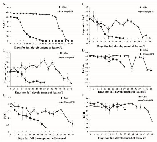 Photosynthetic fluorescence indices of flag leaf samples from the wheat premature senescence mutant (GSm) and its wild-type (WT). (A) Chlorophyll content; (B) Net photosynthetic rate, Pn; (C) Transpiration rate, Tr; (D) efficiency of primary conversion of light energy of photosystem II, Fv/Fm; (E) Non-photochemical quenching coefficient, NPQ; (F) Photosynthetic electron transport rate, ETR. Vertical bars represent standard errors with three independent biological replicates.