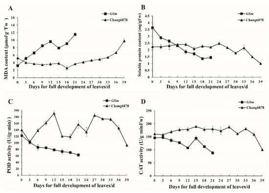 After full expansion of wheat flag leaves, GSm and WT plants (50 each) with uniform growth were selected at random and marked for subsequent sampling. Flag leaf of main spike were sampled at 3 d intervals from the day of full leaf expansion to maturity. MDA content was analyzed with 5% thiobarbituric acid [41,42], and soluble protein content was determined using Coomassie brilliant blue [43]. CAT activity was assayed by UV absorption spectroscopy [44] and POD activity was determined with guaiacol as the substrate [45].