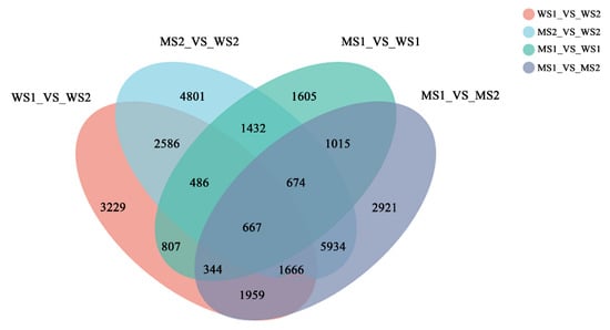 Furthermore, the Venn diagram shows that based on the group comparisons of MS1_VS_WS1 and MS2_VS_WS2, there were 3771 and 14,987 unique DEGs in the S1 and S2 stages, respectively, with 3259 DEGs overlapped between the two libraries (Figure 4). This result suggests that distinctive response mechanisms were adopted in flag leaves of the mutant and WT during the two stages. Then, we randomly selected six genes from the DEGs and quantified their expression in different stages using quantitative reverse-transcription PCR (qRT-PCR). The qRT-PCR data showed that the six genes indeed differentially expressed, which was in agreement with the results of transcriptomic analysis (Supplementary Figure S1). The PCA of the different samples shows that there are differences between groups and little difference within groups (Supplementary Figure S2). Thus, the genome-wide transcriptomic analysis of wheat flag leaves was reliable.