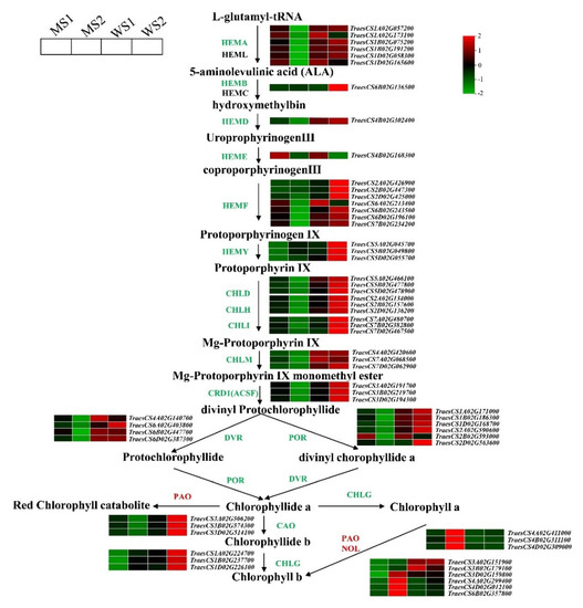 Chlorophyll metabolic pathway. Genes are shown in different colors. Relative gene expression levels are indicated by a color gradient from low (green) to high (red). Squares are arranged from left to right: MS1 (early senescence stage of mutant), MS2 (late senescence stage of mutant), WS1 (early senescence stage of wild-type), and WS2 (late senescence stage of wild-type). Numbers in the scale bar represent normalized transcripts per kilobase million (TPM) values of genes.