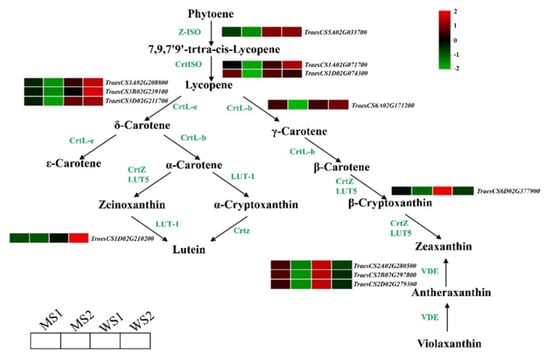 Carotenoid synthesis pathway.Genes are shown in different colors. Relative gene expression levels are indicated by a color gradient from low (green) to high (red). Squares are arranged from left to right: MS1 (early senescence stage of mutant), MS2 (late senescence stage of mutant), WS1 (early senescence stage of wild-type), and WS2 (late senescence stage of wild-type). Numbers in the scale bar represent normalized transcripts per kilobase million (TPM) values of genes.