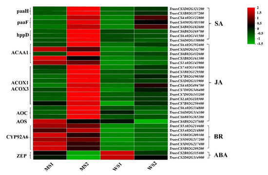 Expression profile clustering of genes involved in different hormone pathways. The expression ratio is standardized based on normalized transcripts per kilobase million (TPM) values, where each vertical column represents the mean of three samples (MS1, MS2, WS1 and WS2), and each horizontal row represents a sample single gene.