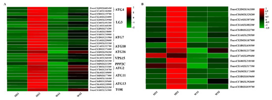 Autophagy plays an essential role in maintaining normal life activities of cells. A total of 29 DEGs encoding autophagy-related proteins (e.g., ATG4, LC3, ATG7, ATG10, and ATG16) were detected. Their transcription in the leaves of GSm was considerably promoted in the MS2 stage (Figure 8A). In addition, there were 16 DEGs mainly participating in hydrolysis and autophagy; these genes showed the same expression patterns, with expression levels being elevated in the GSm mutant during leaf senescence (Figure 8B). These results show that autophagy- and hydrolysis-related genes might play an indispensable regulatory role in macromolecular hydrolysis and cell apoptosis in the GSm mutant during leaf senescence.