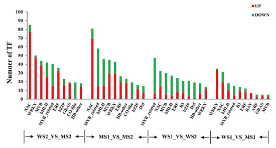 We detected 358, 520, 181, and 494 transcription factors that were differentially expressed in the group comparisons of WS1_VS_WS2, MS2_VS_WS2, MS1_VS_WS1, and MS1_VS_MS2, respectively. The number of differentially expressed transcription factors was relatively high in the group comparisons containing MS2 stage, indicating that more transcription factors took part in the regulation of leaf senescence (Table 6). Then, we identified the top 10 differentially expressed transcription factors in the four group comparisons. The numbers of upregulated genes were more than those of downregulated genes for most transcription factors in the senescence stage (MS1_VS_MS2 and MS2_VS_WS2). Of these, the numbers of upregulated NAC genes were the highest, 77 and 69, which were much higher than the numbers of upregulated genes before senescence, 14 and 19 (WS1_VS_WS2 and MS1_VS_WS1). The second largest class was WRKY and MYB, followed by ERF, all of which had a considerably higher number of upregulated genes after senescence than before senescence. The Co-like family genes were all downregulated in the senescence stage (Figure 9). We identified the transcription factors with relatively high transcript abundance, most of which belonged to the NAC, WRKY, MYB, and AP2 families. These genes showed much higher expression levels in senescent leaves of the mutant (MS2) compared with those of non-senescent mutant (MS1) and WT (WS1 and WS2) leaves. Moreover, WRKY and MYB expression levels were both higher in the mutant than in WT. Furthermore, despite the total number of C2H2 genes in the four groups was not high, their transcript abundances in the mutant were higher compared with those of WT. Thus, these transcription factors played a significant role in premature leaf senescence of the GSm mutant (Figure 10).