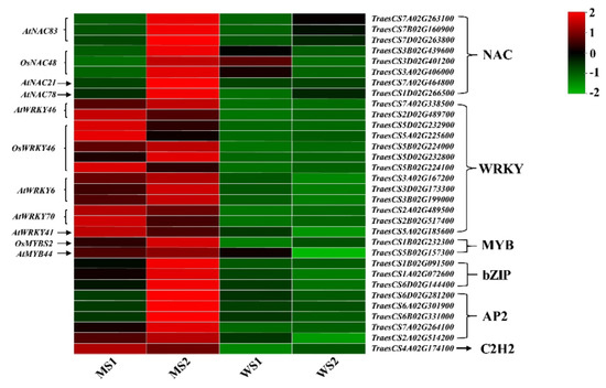 Expression profile clustering of transcription factor related genes. The expression ratio is standardized based on normalized transcripts per kilobase million (TPM) values, where each vertical column represents the mean of three samples (MS1, MS2, WS1 and WS2), and each horizontal row represents a sample single gene.