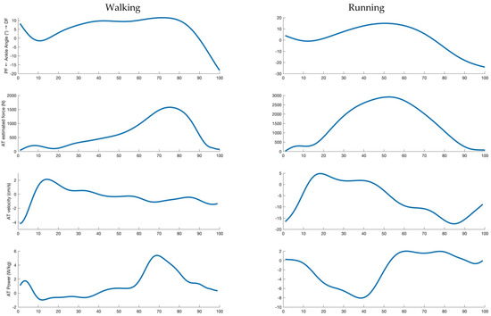 p < 0.001). In addition, AT and GM MTU power were higher in running than in walking at all the investigated speeds (