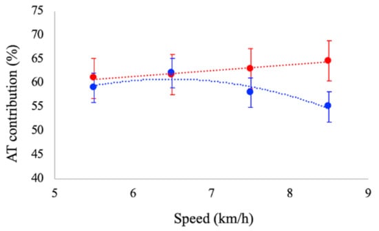 Figure 2). At paired speeds, significant differences were reported between tasks at 7.5 and 8.5 km/h: the contribution of AT was significantly larger in running (62% and 64%) than in walking (58% and 55%), respectively.