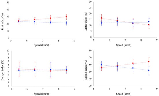 p < 0.05), respectively. At paired speed, strut index was significantly larger in running than walking at 6.5, 7.5 and 8.5 km/h. No significant differences between gaits were reported for damper index at all the investigated speeds. Spring index was significantly larger in running at 7.5 and 8.5 km/h, whereas no significant differences were observed between tasks at 5.5 and 6.5 km/h. Finally, motor index was larger in running than in walking at 5.5 km/h, whereas at 8.5 km/h it was larger in walking.