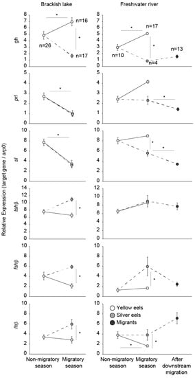 - Sudo, R.; Suetake, H.; Suzuki, U.; Aoyama, J.; Tsukamoto, K. Profiles of mRNA expression for prolactin, growth hormone, and somatolactin in Japanese eel, Anguilla japonica: The effect of salinity, silvering and seasonal change. Comp. Biochem. Physiol. A 2013, 164, 10–16. [Google Scholar] [CrossRef] [PubMed]
