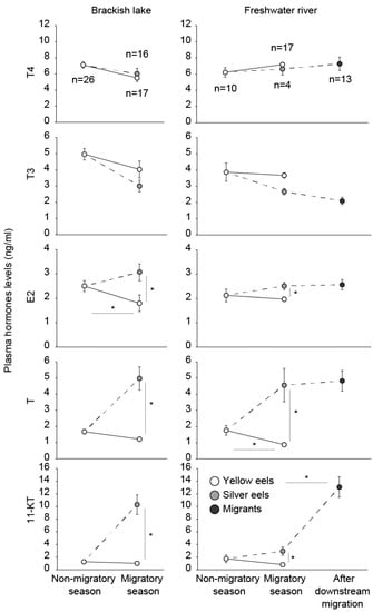 - Han, Y.S.; Liao, I.C.; Tzeng, W.N.; Huang, Y.S.; Yu, J.Y.L. Serum estradiol-17 and testosterone levels during silvering in wild Japanese eel Anguilla japonica. Comp. Biochem. Physiol. B 2003, 136, 913–920. [Google Scholar] [CrossRef]