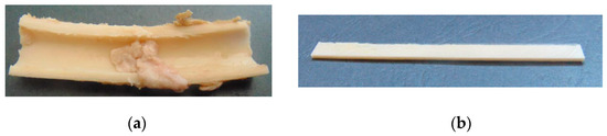 The epiphysis and metaphysis of goat femurs were separated from the diaphysis using a pneumatic surgical motor system. A longitudinal cut was performed in the diaphysis of the femur, resulting in its separation into two bone fragments (Figure 1a). Each bone section was flattened using a polishing machine from Struers®, Cleveland, OH, USA (model ROTOPOL), resulting in regular specimens (Figure 1b).