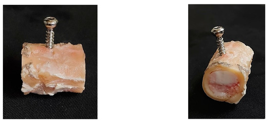 Epiphyses were first removed from the femoral diaphysis cortex. Three osteotomies were executed in the diaphysis region to obtain four identical bone samples (30 mm in length each). Each sample was then radially drilled in the central section and thread-milled to allow fastening cortical screws (nominal diameter of 4.5 mm; Synthes, AO®, Solothurn, Switzerland) through the cortical wall and bone marrow (Figure 2).