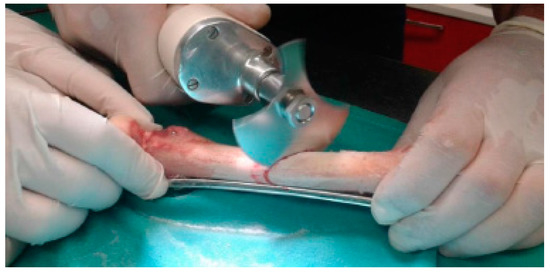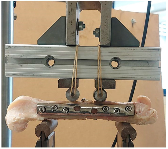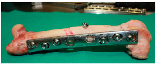 Osteotomies were performed in femur shafts using a surgical motor system to mimic an oblique fracture in the central region (Figure 3). The fixation of metal plates (standard 4.5 mm broad DCP; Synthes, AO®, Solothurn, Switzerland) was preceded by femur thawing at room temperature (21–23 °C) while keeping the bone hydrated in saline solution. Osteosynthesis plates (OP) were previously contoured to the lateral face of the femur, rendering possible the correct alignment of bone segments. This procedure followed surgical protocols currently executed to allow adequate bone healing. Six threaded holes were executed along the femur shaft, and one perpendicularly to the central oblique fracture to fasten cortical screws. A 4.5 mm broad DCP plate with 8-holes was applied using six bicortical screws (4.5 mm of nominal diameter; Synthes, AO®), in a neutralization function, subsequent to thread-milling operations. A lag screw (3.5 mm of nominal diameter; Synthes, AO®), placed perpendicularly to the fracture line and externally to the DCP, was fixed in such a way as to ensure mechanical stabilization of the oblique fracture, while assuring the dynamic compression along the fracture line (Figure 4).