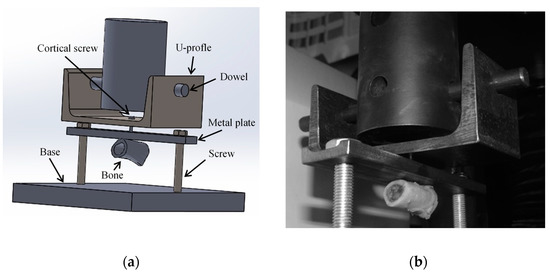 Pull-out strength (POS) tests were performed in four shaft sections harvested from goat femurs in coincident positions to the ones used to fix the osteosynthesis plate. During the test, bone samples were immobilized by a metal plate rigidly fixed by two screws fastened to a base (Figure 5a). The bicortical screw was pulled out by its head, which was fixed to a steel U-profile and a dowel. A universal testing machine (INSTRON® 4208), equipped with a 5 kN load cell was used to conduct the pull-out tests at 0.5 mm/min. The adopted experimental protocol ensured that the energy transmitted to the mechanical system was mostly dissipated in the form of damage in the bone threaded region (Figure 5b). The experimental data ( P δ curve) from this test allowed the identification of cohesive parameters required to characterize the connection at the bone–screw interface.