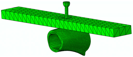The bone shaft for the FPB test (Figure 8b) was modeled in two halves with 133,536 6-node linear triangular prism elements, while the DCP plate and the four cylinders were modeled with 77,222 4-node tetrahedral elements and 576 8-node brick elements, respectively. The bicortical screws (six to fasten the plate and one for the lag) were modeled in the same way as for the POS test. As for the interfaces of screw-cortical bone, a total of 765 6-node cohesive elements (6-C) with null thicknesses were disposed along the screw shafts of seven bicortical screws, while 548 6-CEs were disposed in the bone shaft to allow damage initiation and propagation in the vicinity of the screw holes. Contact pairs (CP) were also considered in all contacts (i.e., bone plate shaft, plate screw, bone cylinder shaft) to prevent interpenetration in the course of the loading process.