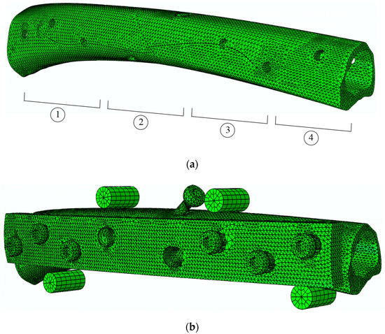 Figure 8. Finite element mesh (a) of the bone shaft (approximately 30 mm in length each) showing four (1–4) regions to perform pull-out strength tests, and (b) the four-point bending (FPB) tests.